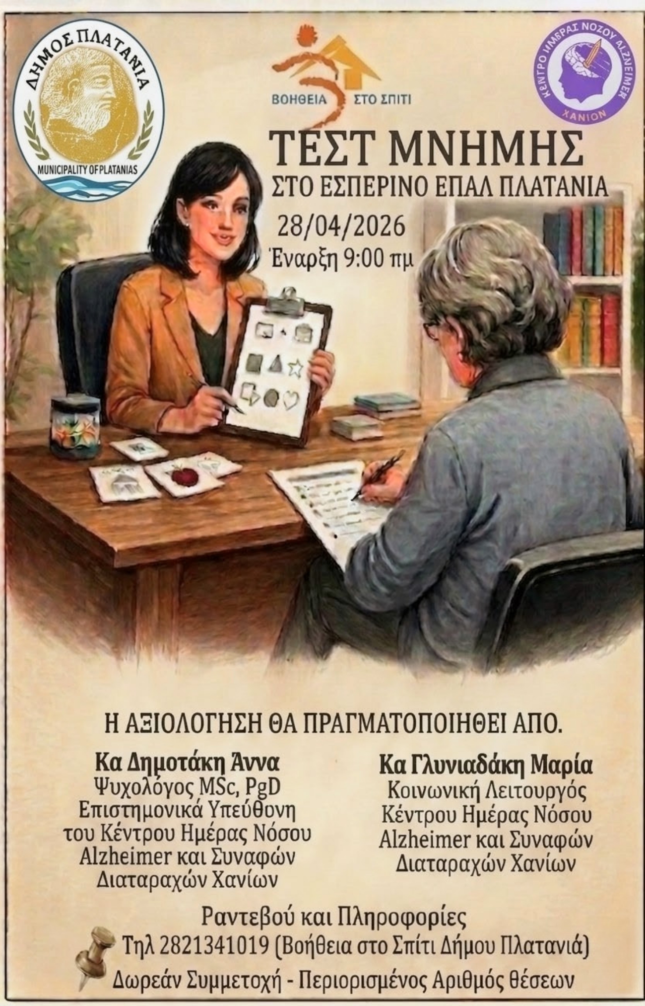 Το Πρόγραμμα «Βοήθεια στο Σπίτι» του Δήμου Πλατανιά, σε συνεργασία με τοΚέντρο Ημέρας Νόσου Alzheimer και Συναφών Διαταραχών Χανίων,διοργανώνουν δράση προληπτικού ελέγχου μνήμης την Τρίτη 28 Απριλίου2026, στο Εσπερινό ΕΠΑ.Λ. Πλατανιά στον Ταυρωνίτη, από τις 09:00 έωςτις 14:00.Στο πλαίσιο της δράσης θα πραγματοποιούνται δωρεάν τεστ μνήμης με στόχοτη διερεύνηση και τον έγκαιρο εντοπισμό πιθανών ενδείξεων […]