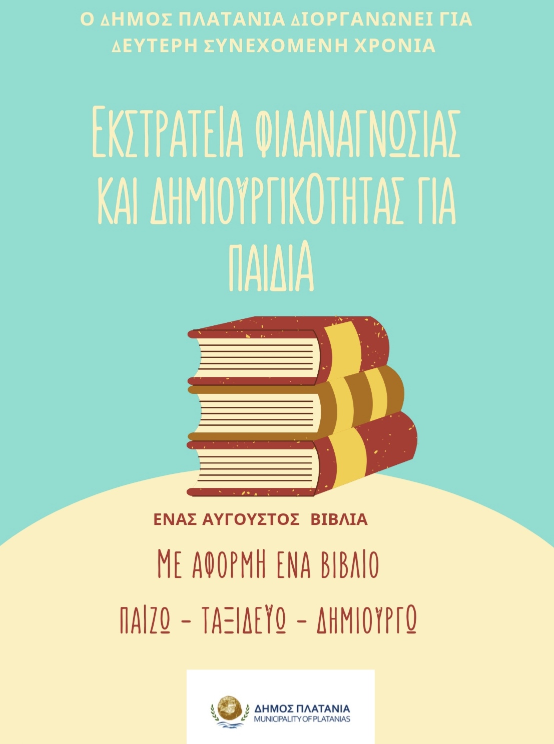 Ο Δήμος Πλατανιά διοργανώνει και φέτος καλοκαιρινή εκστρατεία φιλαναγνωσίαςμετά την επιτυχημένη περυσινή πρώτη σειρά δράσεων, που υλοποιήθηκε με μεγάλησυμμετοχή παιδιών, ηλικίας από 4-12 ετών.Η κινητή βιβλιοθήκη του Δήμου Πλατανιά θα ταξιδέψει και αυτό το καλοκαίρι στιςτέσσερις Δημοτικές Ενότητες του, κάνοντας στάσεις σε φυσικά τοπία, προσφέροντας σταπαιδιά την ευκαιρία να δανειστούν βιβλία και να συμμετέχουν σε […]