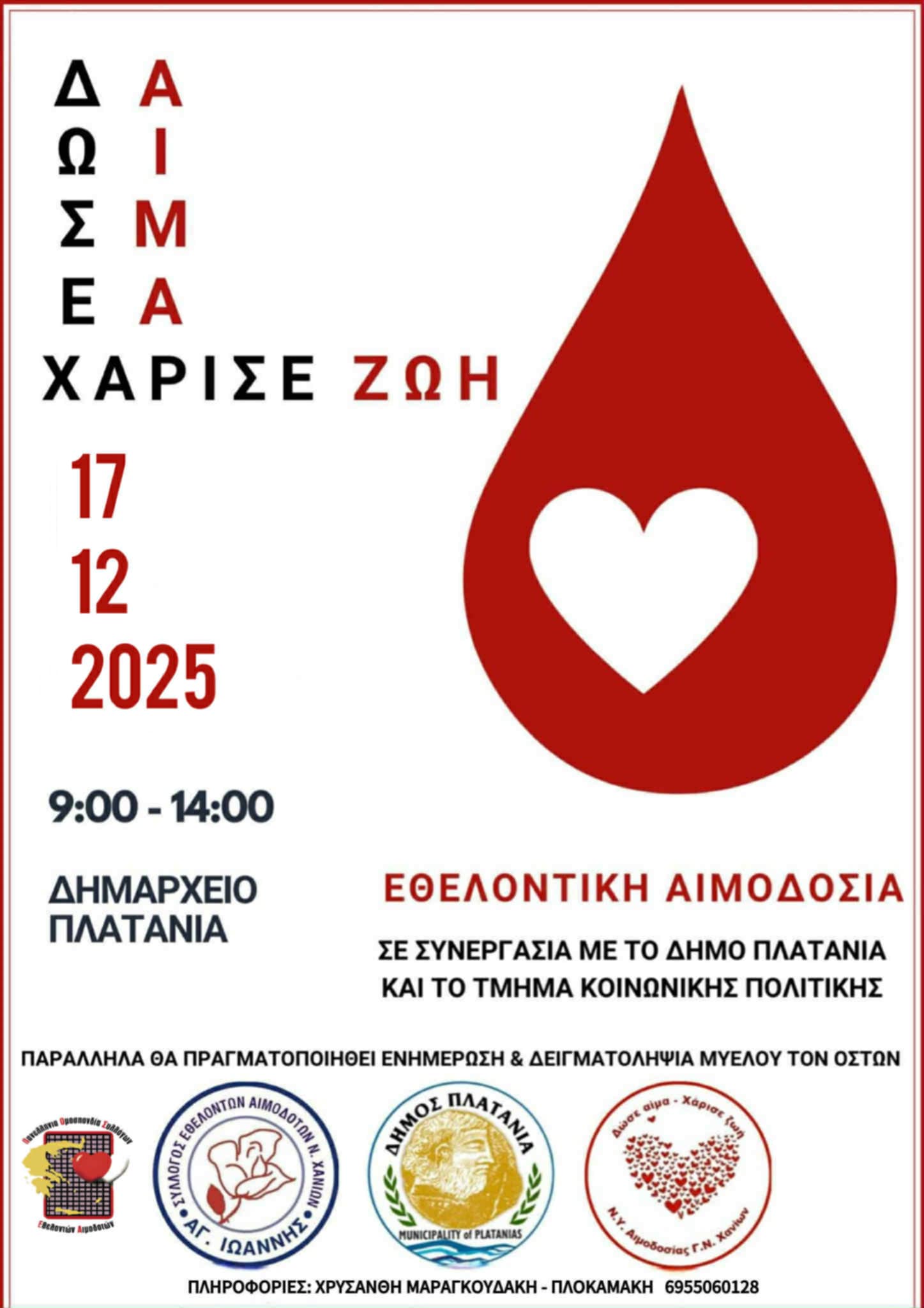 Ο Δήμος Πλατανιά, σε συνεργασία με τον Σύλλογο Εθελοντών Αιμοδοτών Νομού Χανίων «Άγιος Ιωάννης» και το Τμήμα Αιμοδοσίας του Γενικού Νοσοκομείου Χανίων «Άγιος Γεώργιος», ενημερώνει τους δημότες ότι η προγραμματισμένη εθελοντική αιμοδοσία μεταφέρεται, λόγω της πανελλαδικής κινητοποίησης της ΚΕΔΕ. Η εθελοντική αιμοδοσία θα πραγματοποιηθεί την Τετάρτη 17 Δεκεμβρίου 2025, από τις 09:00 π.μ. έως τις […]