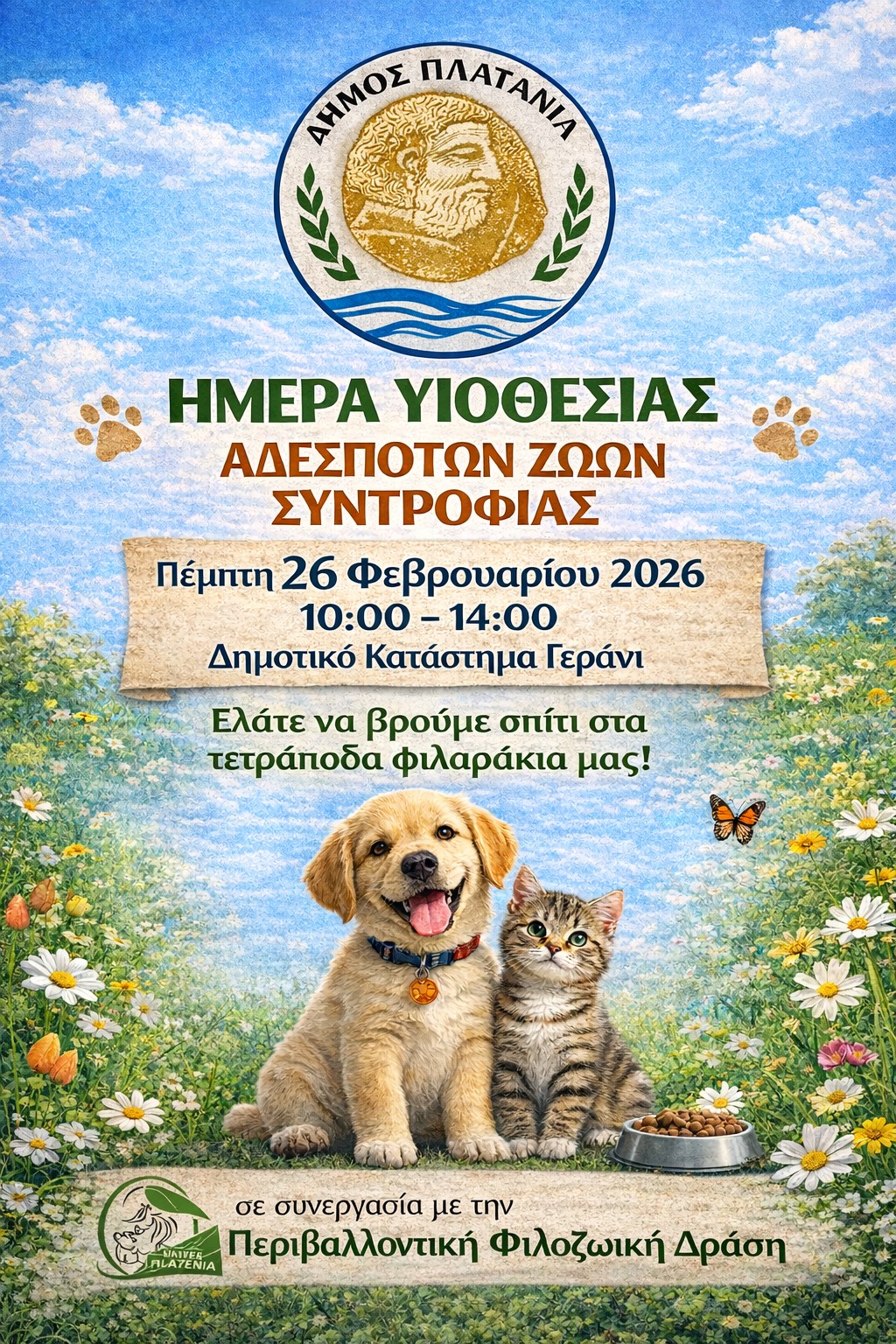 Ο Δήμος Πλατανιά σε συνεργασία με τη Φιλοζωική Περιβαλλοντική Δράσηδιοργανώνει ̈Ημέρα Υιοθεσίας”, την Πέμπτη 26 Φεβρουαρίου 2026, από τις 10:00π.μέως τις 2:00μ.μ, στο Δημαρχείο Πλατανιά, στο Γεράνι, στο πλαίσιο της προσπάθειαςευαισθητοποίησης των πολιτών για τα αδέσποτα ζώα συντροφιάς.Κατά τη διάρκεια της δράσης, που έχει στόχο να δώσει στα αδέσποτα ζώα του δήμου μαςτη φροντίδα, την […]