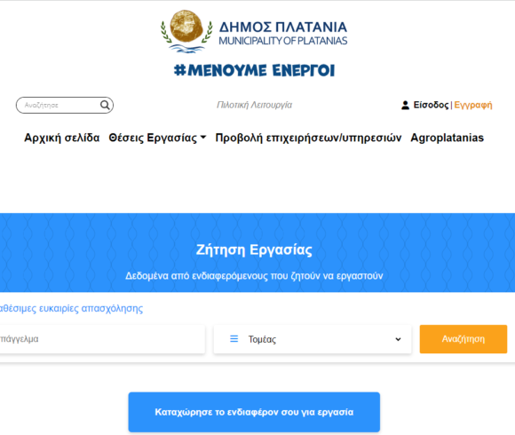 Ο Δήμος Πλατανιά, αξιοποιώντας τις νέες τεχνολογίες και στο πλαίσιο τηςενίσχυσης της ψηφιοποίησης των λειτουργιών και των υπηρεσιών του, προχώρησε στηδημιουργία της ψηφιακής εφαρμογής “Μένουμε Ενεργοί”, με στόχο να συμβάλλει στηστήριξη της τοπικής επιχειρηματικότητας και στην καταπολέμηση της ανεργίας.Το “Μένουμε Ενεργοί” ( https://menoume-energoi.crowdapps.net/platanias/ ) αποτελείμια εφαρμογή προσφοράς και ζήτησης εργασίας στους παρακάτω επαγγελματικούςκλάδους:-Αγροτικά Επαγγέλματα-Τουρισμός-Εστίαση-Αγροδιατροφή-Τέχνη Πολιτισμός-Εκπαίδευση-Υποστήριξη […]